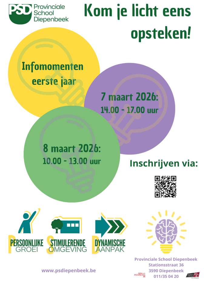 Op zaterdag 7 (van 14u. tot 17u.) en zondag 8 maart 2026 (van 10u. tot 13u.) organiseren wij onze infomomenten. We laten je kennismaken met alles wat de school te bieden heeft en dit tijdens een rondleiding van ongeveer een uur langs een vast uitgestippeld parcours doorheen de schoolgebouwen.