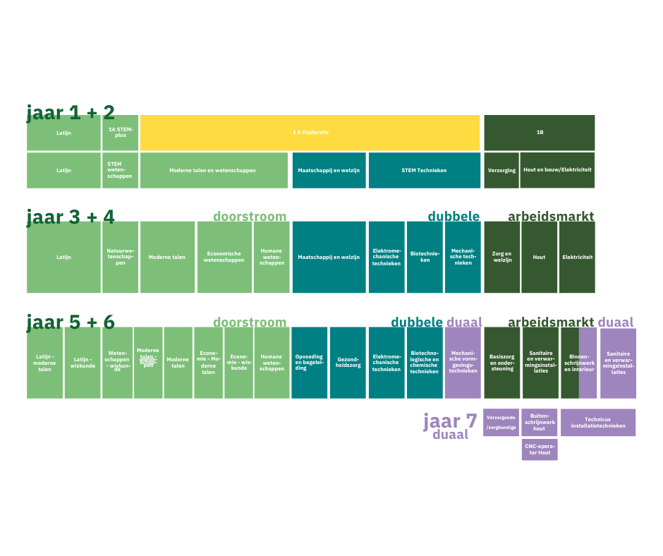Hierdoor ziet het overzicht van de opleidingen die wij aanbieden er anders uit voor leerlingen die starten in het eerste, tweede of derde jaar, dan voor leerlingen die in één van de hogere jaren instappen.